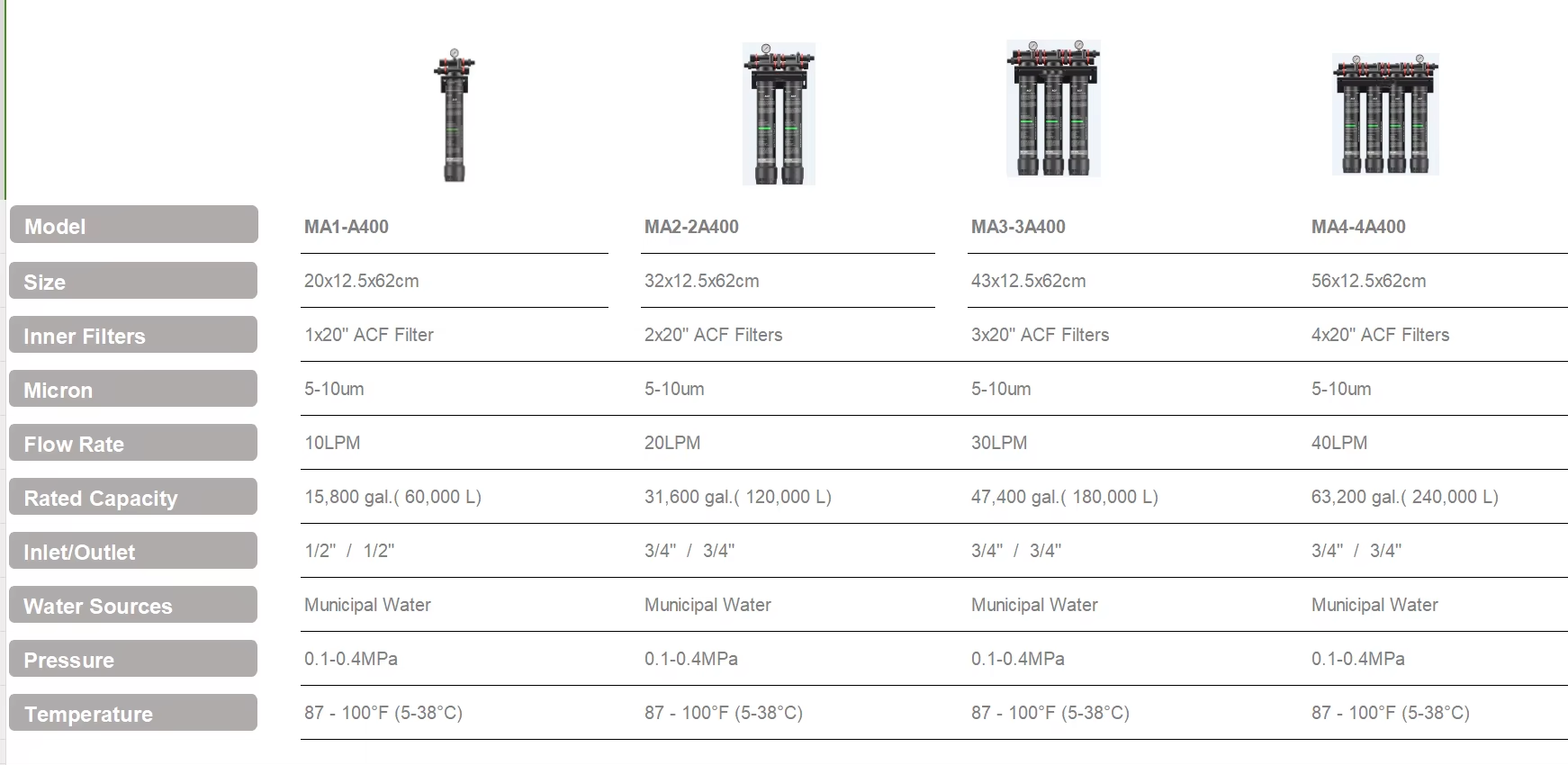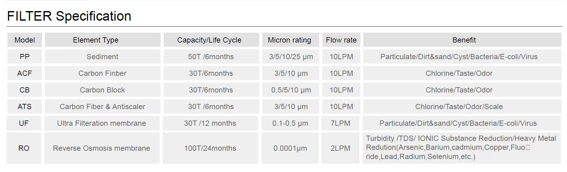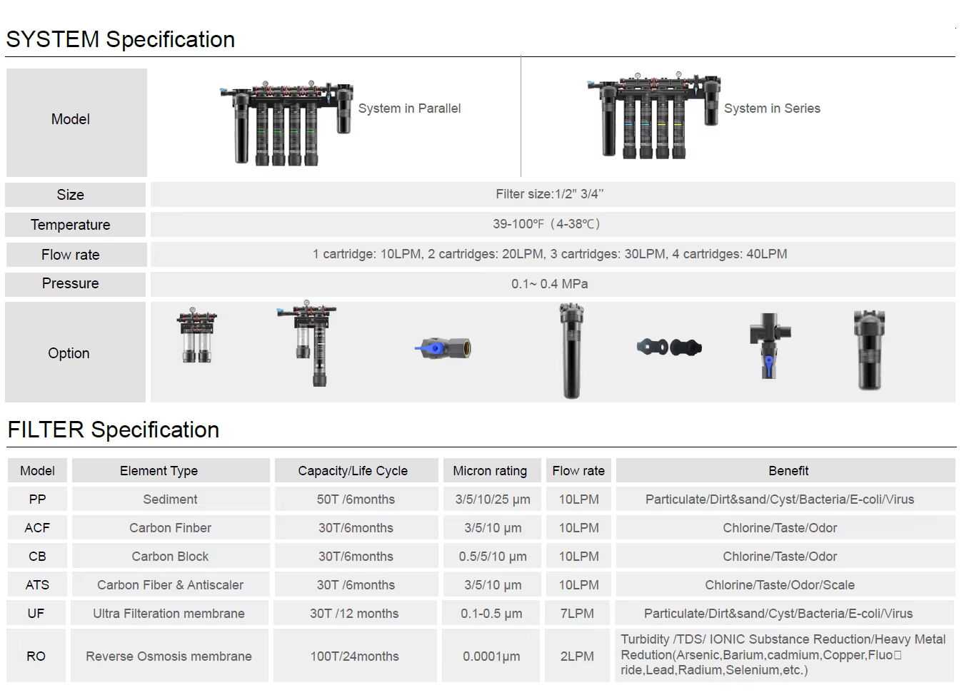 | Inner filter | 2x20"UF+1x20"CB 1xPP pre filter 1xFOF post filter |