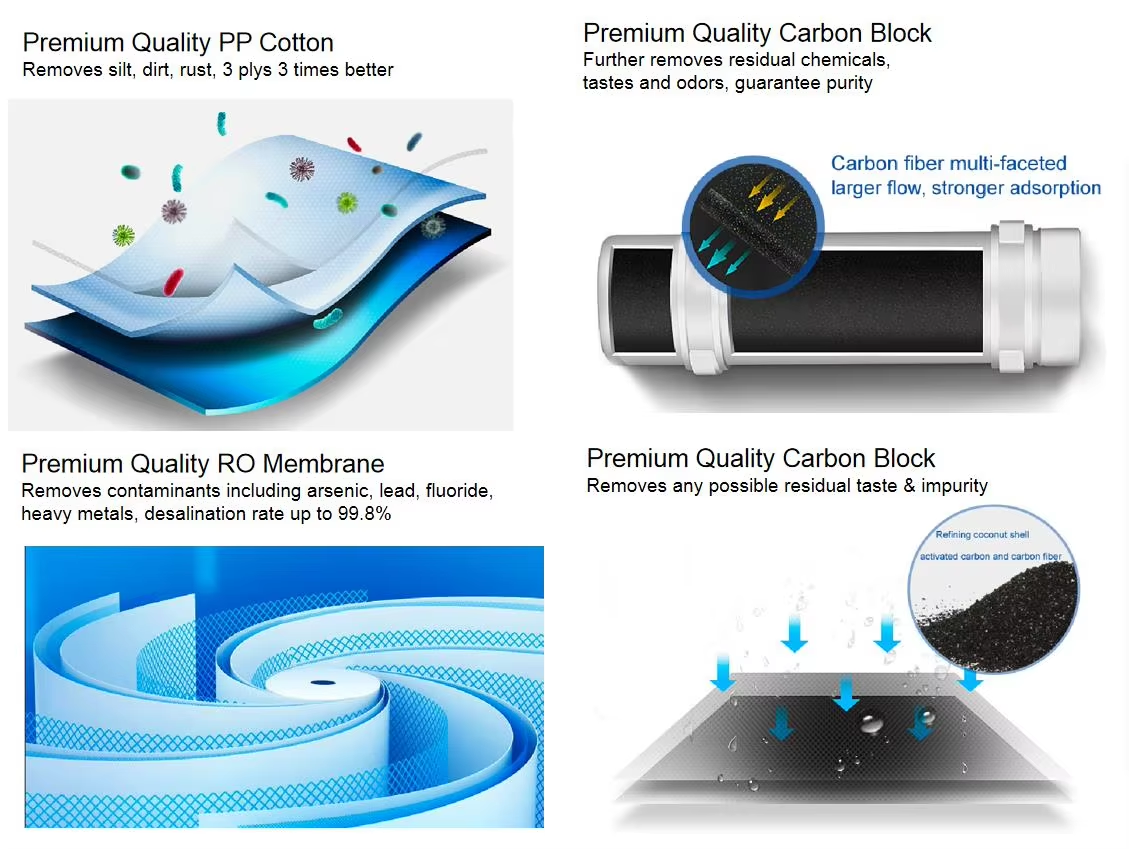 Working pressure: 0.1-0.4Mpa Working Temperature: 0-50°C Features: 1. Quick replacement for filter 2. Only half size of traditional model 4. Stable flow rate RO membrane, long lifespan 5. Optional for wall-mounted and freestanding
