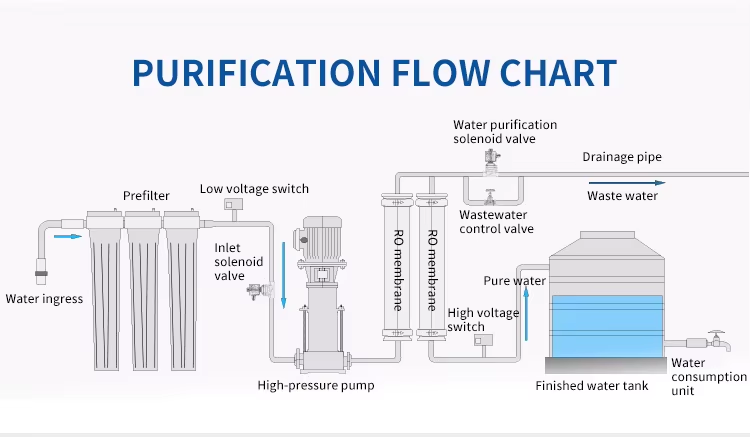 In this system, we add the PLC and touch screen which can help you to make the remote control when you don't have time in local point. 1. With the remote control function, you can use your mobile phone and computer to work in the other place. 2. To achieve the remote control function, you first need to have a hot spot, network cable or WIFI 3. When the device happen any problems, you can be notified in time by phone, SMS and email 4. It will periodically prompt you to replace the filter