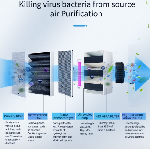 Filtration Layer | H13 HEPA filter*1+ carbon filter* 1+ Nylon Prefilter*1 +Tio2 filter*1 + UVC Lamp* 1 + Plasma * 1 |