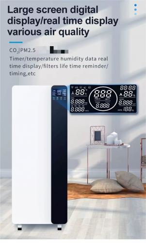 Function | Air quality indicator ,WiFi, CO2 value, PM2.5 value, TVOC value, HCHO value, Temperature &humidity, Real-time air volume value, Timing, HEPA filter life time(%), HEPA filter replace reminder, Sleeping, child lock |