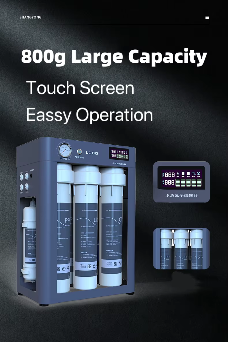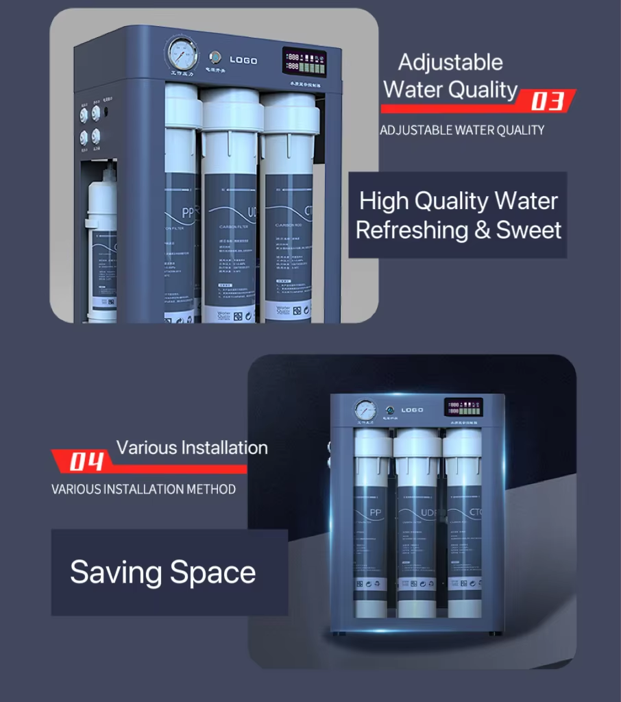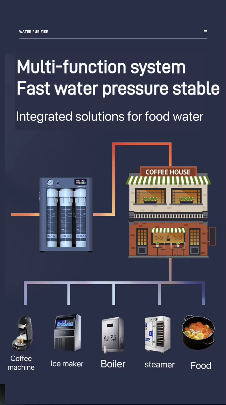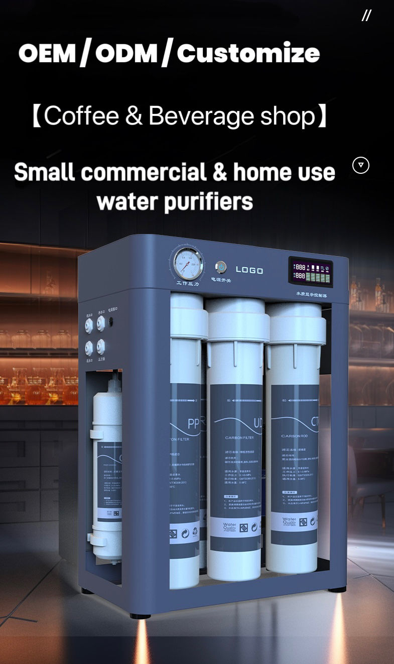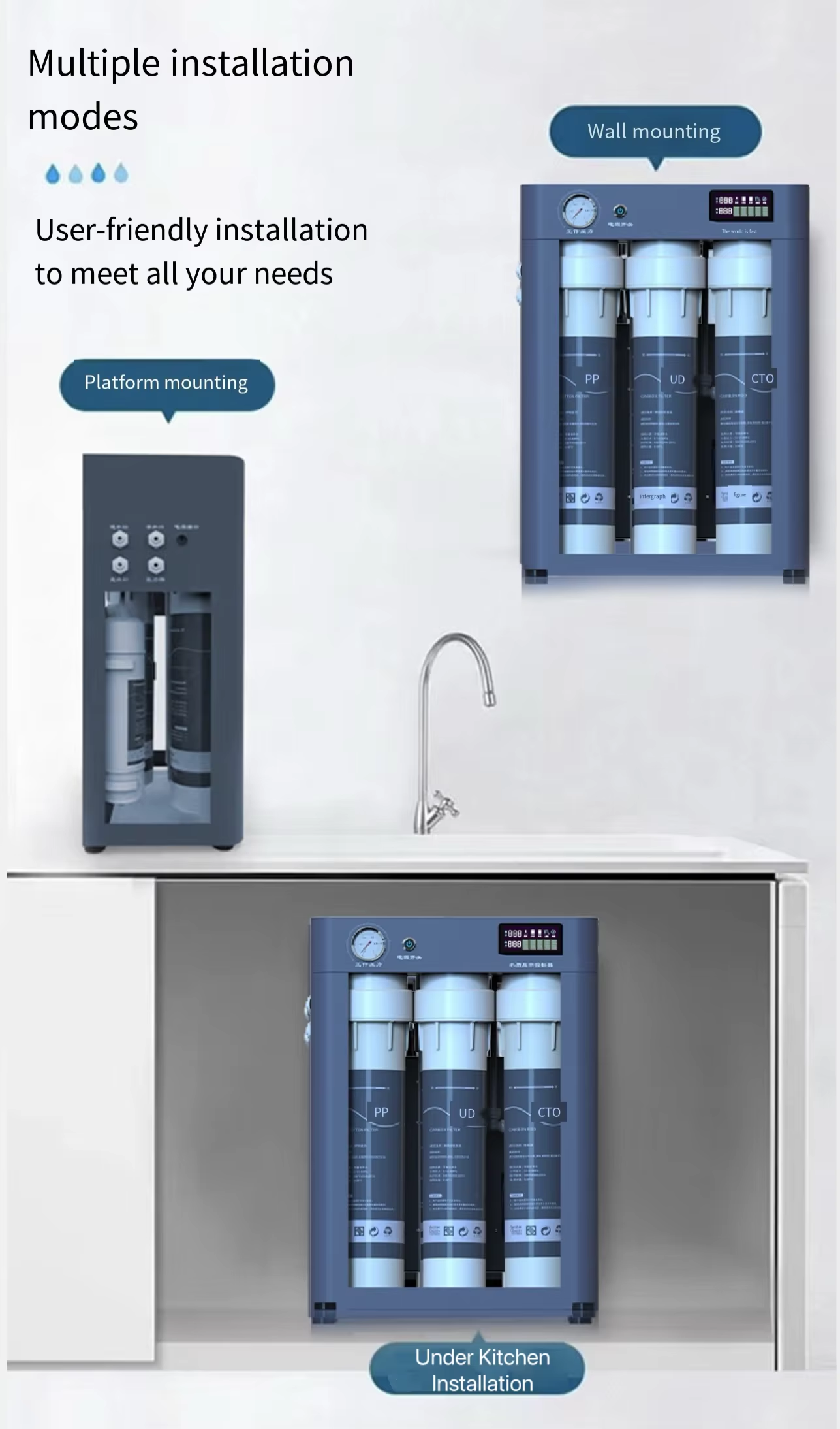 It has a wide range of applications, high-end appearance,andnon-disposable snap-in filter cartridges for quickreplacement. The dirt is visible, and the market old oneis low. It is more suitable for small drinking water places,and can be installed inside cabinets or on walls.It is the first choice forbar counters and milk - tea shops.