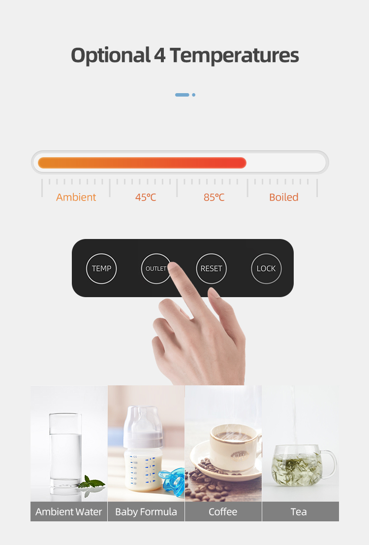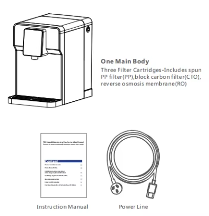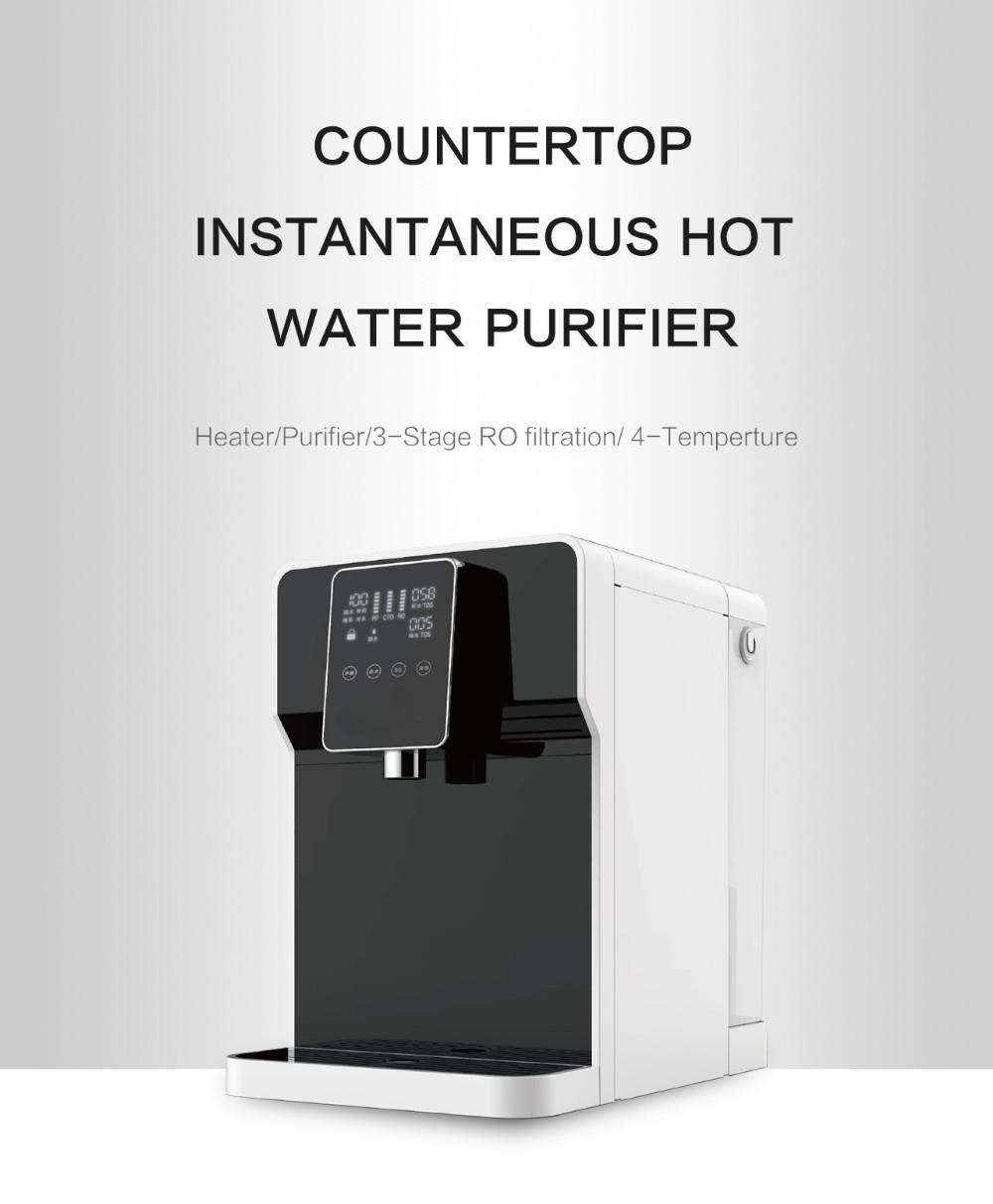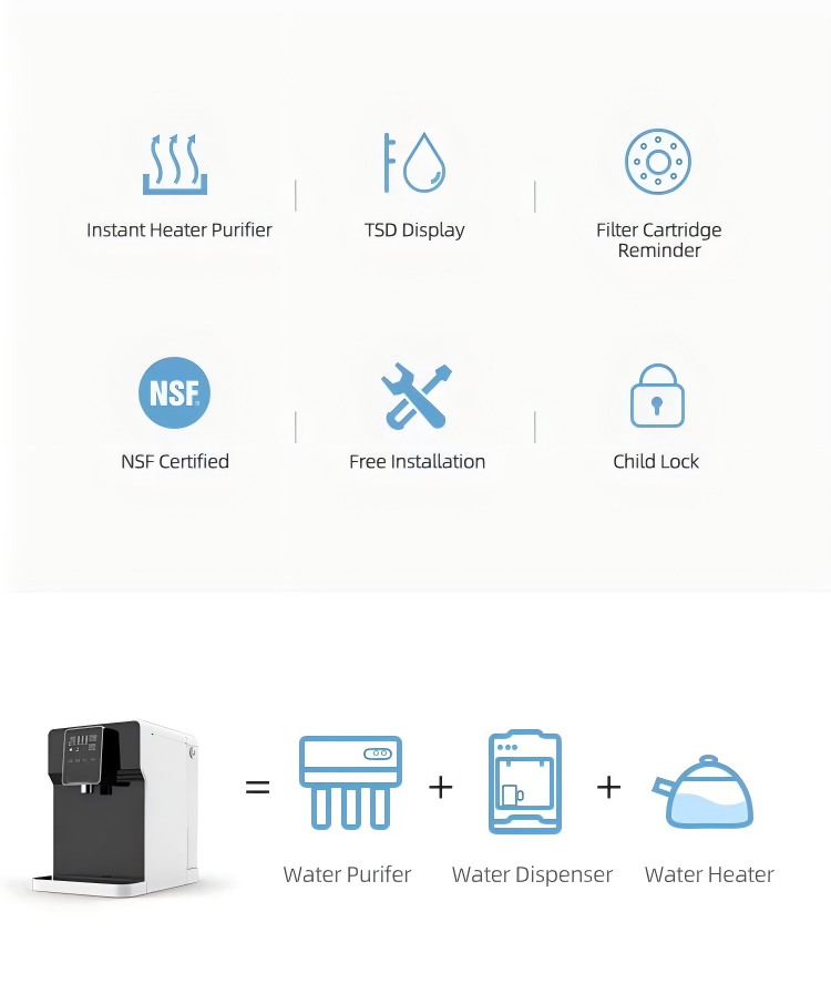 This desktop RO system water purifier dispenser features 3-stage filtration (PP, CTO, RO) and offers purification and heating functions with temperature settings of 100°C, 85°C, and 45°C. It has a 75GPD flow rate, 4.5L source water tank, and ≥95% rejection rate, making it ideal for home or office use. The product is CE certified, ensuring compliance with EU safety standards and providing market access. With a compact design (400*106*455mm), touch panel, and 1-year warranty (excluding cartridges), it combines functionality and reliability.