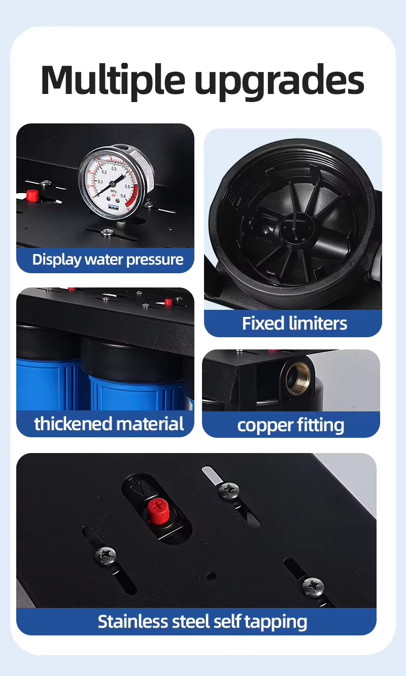 This Household Water Purifier features a 4.5*20 inch big blue housing with 3 filtration stages, suitable for household, commercial, and RV use. It offers a flow rate of 3000 GPD, self-cleaning functionality, and is made of durable stainless steel. The system includes brass or plastic thread connections and supports multiple color options such as blue, white, orange, and gray.